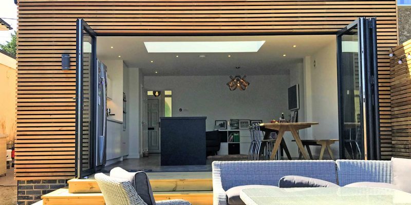 One of our most favourite of recent projects is this high-end house extension in Oxford where we used a specific larch timber cladding profile with a shadow gap detail to clad the walls along with slimline aluminium windows and doors to achieve what we think is an exceptional appearance. It certainly stands out from the crowd.